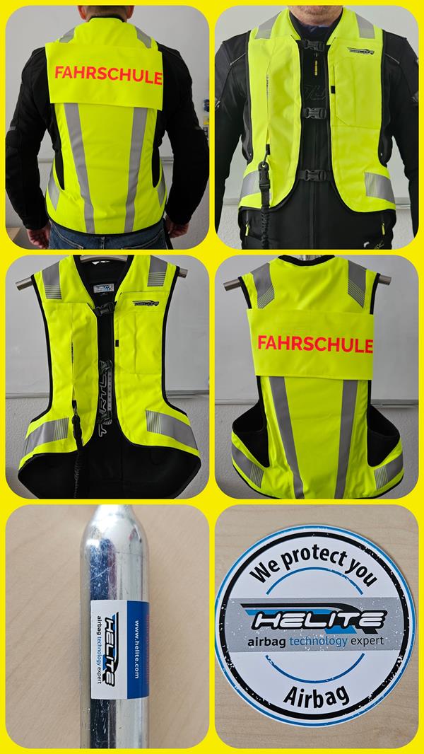 Die Westen, die wie normale Motorradwesten inklusive Rückenprotektor getragen werden, schützen sowohl unsere Fahrschüler*innen als auch unseren Fahrlehrer bei Stürzen. In nur 0,1 Sekunden wird durch eine Reißleine das Airbagsystem ausgelöst. Die Westen absorbieren effektiv Stöße, stabilisieren den Oberkörper inklusive Halswirbelsäule und reduzieren das Risiko einer Überbiegung der Wirbelsäule.